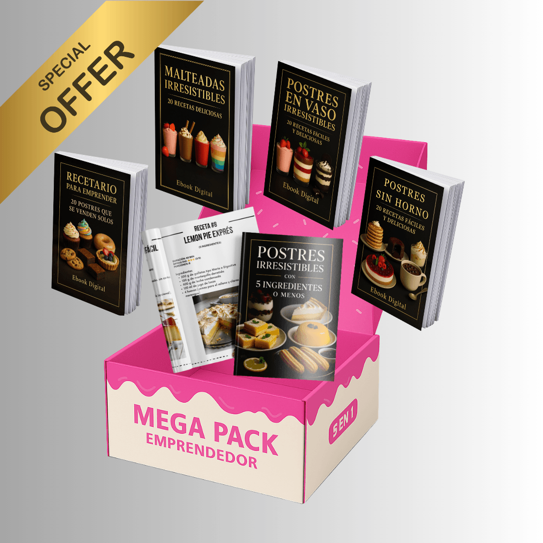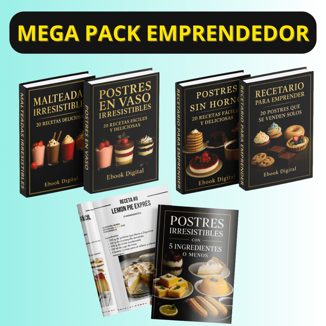 Este Mega Pack Emprendedor reúne 5 recetarios digitales con más de 130 recetas irresistibles para preparar, presentar y vender postres y malteadas deliciosas.
